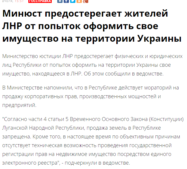 Несмотря на существование в той же "ЛНР" "Временного положения о порядке государственной регистрации прав на недвижимое имущество", которое упомянуто в сообщении на "ЛИЦ", люди боятся не то что перерегистрировать недвижимое имущество (например, после смерти владельца для вступление в наследство) в соответствующих органах самопровозглашенных "республик", но даже предпочитают не уведомлять эти органы об изменениях.