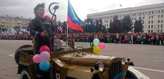 И действительно, дальнейшее действие практически дословно воспроизводило первомайские демонстрации восьмидесятых (более ранних я просто не застал). Трудовые коллективы шли мимо сцены Русского драмтеатра, где стояли руководители «ЛНР». Трудящиеся несли знамена, шары, цветы и по-разному выражали свою радость. Играла советская музыка, та же, которая звучала на советских демонстрациях. Демонстрацию транслировали в прямом эфире «Луганск 24». Народу было довольно-таки много.