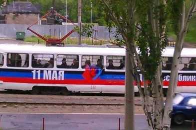 На улицах Донецка появились трамваи и троллейбусы, расписанные в «республиканские» цвета и с надписью «11 мая - день республики».