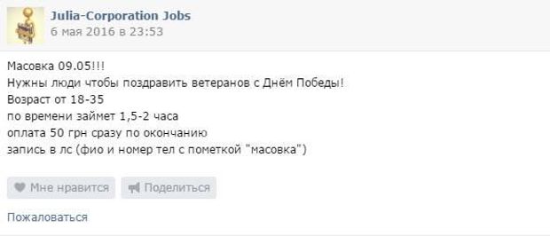 В Украине поиски "массовки" для различных массовых мероприятий через интернет за денежное вознаграждение уже давно стали привычным явлением. 9 мая в этом году не стало исключением.