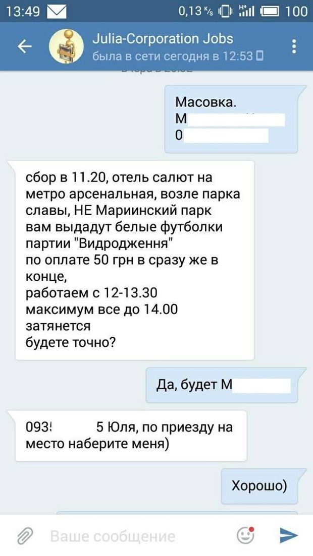 В свою очередь заместитель председателя киевской ячейки партии "Возрождение" Валерий Бацула, который также был на месте, где собралась "массовка", в комментарии 24 Каналу заявил, что никаких денег за участие в мероприятиях под патронатом их партии они не выдают.