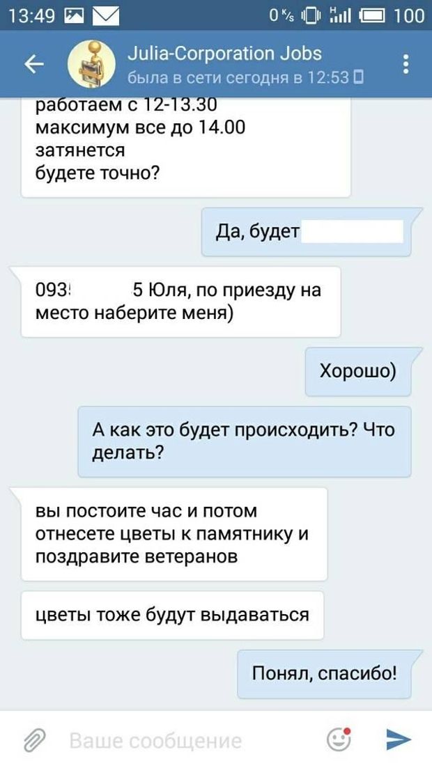 Связавшись с организаторами, журналист получил подробную информацию — необходимо будет постоять час, отнести цветы, которые также дадут "орагнизаторы", к памятнику и поздравить ветеранов. Участникам также выдавали футболки политической партии "Возрождение".