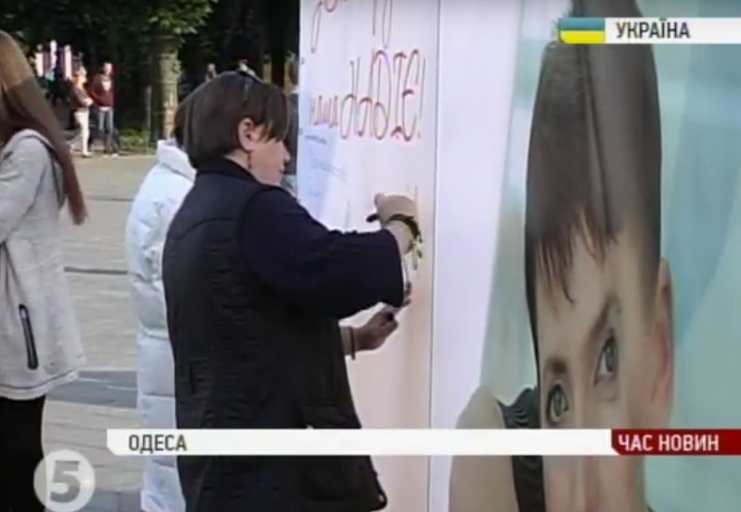 Активисты развернули большой баннер с изображением Надежды, а рядом каждый мог написать слова поддержки к Савченко. Буквально за 10 минут белый лист заполнился поздравлениями и пожеланиями свободы. А организаторы собрали подписи за освобождение Надежды, которые уже сегодня планируют передать в российское консульство.