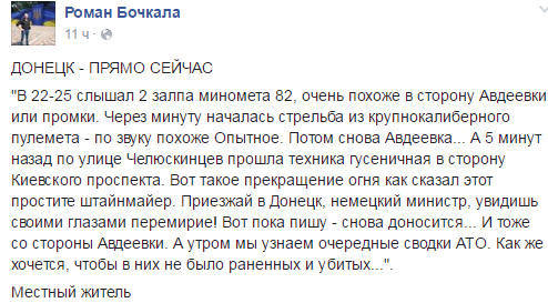 "Вот такое прекращение огня. Пусть господин Штайнмайер приедет в Донецк и увидит своими глазами это прекращение. Вот пишу и слышу за окном – снова доносится", - процитировал у себя в Facebook слова жителя Донецка журналист Роман Бочкала.