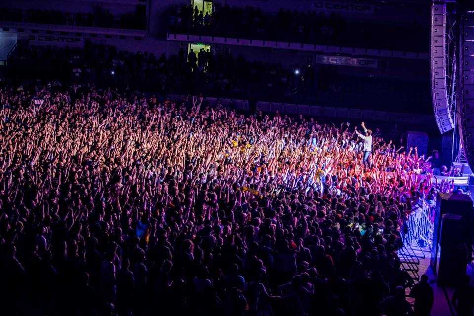 Перед спорткомплексом тем временем собралось около 20 тысяч зрителей, почти столько же было внутри. Апофеозом концерта стало исполнение гимна Украины. Его спели все 40 тысяч зрителей.