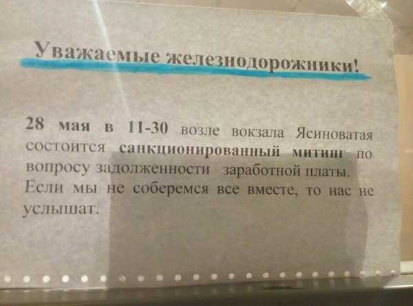 Источник сообщает, что не все работники согласны с такими действиями, однако уже в социальной сети появилось фото объявления о завтрашнем митинге. В субботу, 28 мая, в 11.30 запланирована акция возле вокзала в оккупированном городе Ясиноватая.