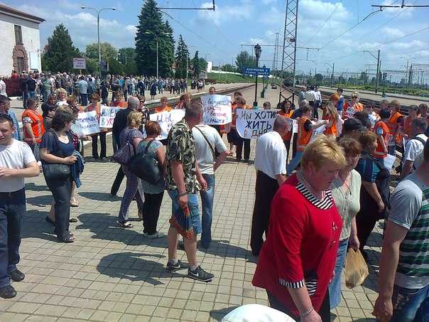 В оккупированной Ясиноватой сегодня, 28 мая, митингуют работники железной дороги. Они требуют от украинского государства выплату долгов по заработной плате, однако на плакатах у некоторых написаны лозунги в поддержку незаконной организации «ДНР». Например, «Мы хотим жить в ДНР».