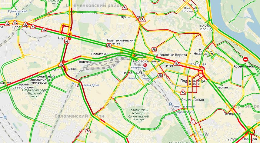 В заторах застыл центр города, Подол, Чоколовский бульвар, улица Гетьмана, проспект Победы, Окружная, Московский мост и мост Метро.