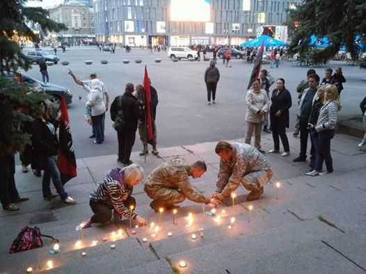 "На центральной площади Днепра начали собираться люди, чтобы почтить память погибших прошлой ночью добровольцев. Их, как минимум, шестеро: четверо из ПС, двое из Айдара. Около 20 раненых. Люди зажигают свечи".