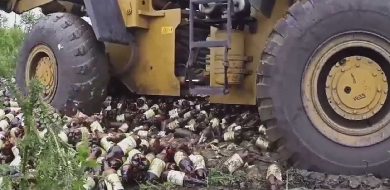 Детально изучив все глумления над "санкционной пищей", которые регулярно проделывают их коллеги из Российской Федерации, силовики ЛНР смогли привнести в этот процесс надругательств нечто свое. Так, например, в данном видеосюжете показано, как по закрытым бутылкам с просроченным пивом гордо и под победную музыку проезжает "лнровский" бульдозер, при этом не нанося ущерб основной массе закрытых бутылок.