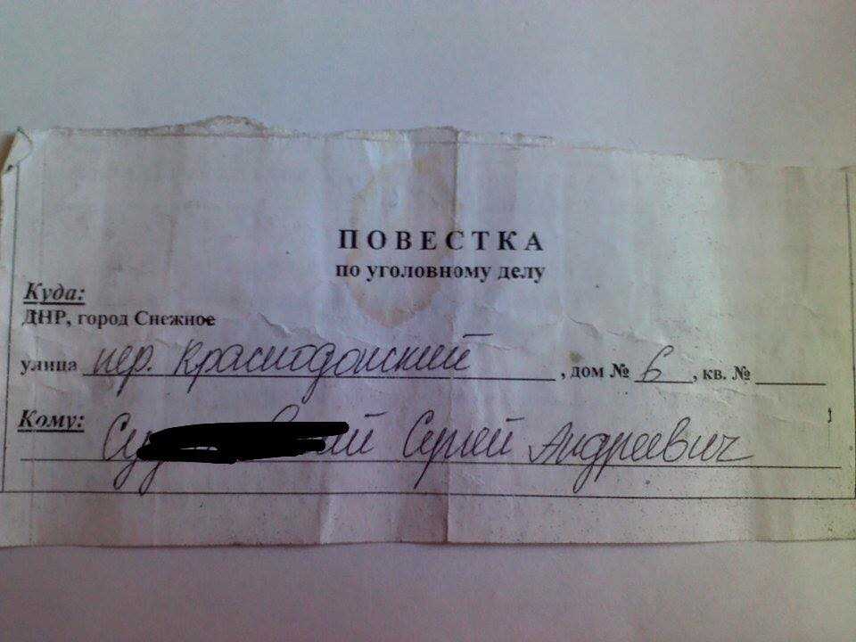 Написал человек из Снежного. О том как заставляют на местную мобильную связь переходить. В качестве иллюстрации фото повестки ДНР. Просто вот так она выглядит. И ждёт любого, кто публично за Украину.