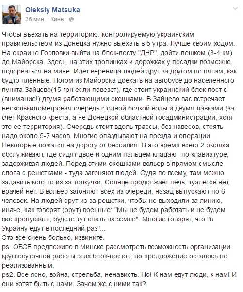 Донецкий журналист Алексей Мацука написал у себя в Фейсбуке о том, с какими трудностями сталкиваются люди на украинских блокпостах.