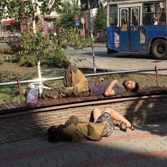 На нем запечатлены два «ополченца», которые спят прямо на улице — один на парапете, второй на земле под ним. По предположениям дончан, оба пьяны.