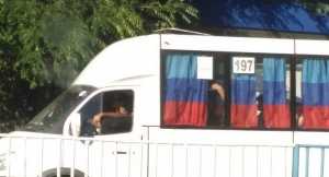 В оккупированном Луганске водитель маршрутного такси №197 вывесил на окна шторы голубо-сине-красного цвета – как на флаге непризнанного квазигосударства "ЛНР".