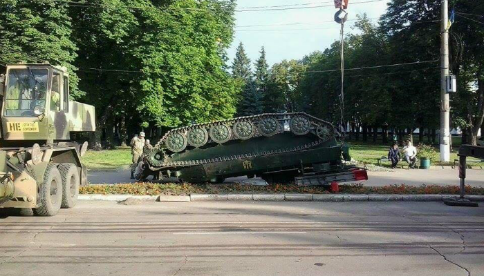 Причина того, почему эта боевая машина перевернулась, неизвестна. Судя по размещенному у установки полуприцепу-платформе, можно предположить, что машина оказалась вверх гусеницами во время ее транспортировки по городу.