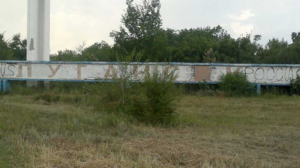 "Две стелы на выезде из Луганска. На одной в рамках борьбы с хунтой трогательно закрасили мягкий знак. Сразу видно теперь, что Луганск - это Россия. Действительно мягкий знак только портил такую прекрасную инсталляцию.