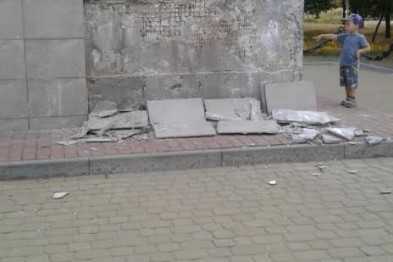 "Этот обелиск памяти рушится на наших глазах. Еще в конце мая стало заметно, что плитка, которой обложен памятник, начала отходить. Но к сожалению никто из представителей власти не отреагировал на замечания жителей. Но то, что происходит в последние несколько недель, вообще не дает нам спокойно смотреть на происходящее. Плитка откалывается просто на глазах, вокруг гуляют дети. И это может в любой момент привести к трагическим последствиям", - пишут жители.