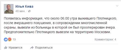 "Появилась информация, что около 06.00 утра выжившего Плотницкого, после вчерашнего покушения, в сопровождении многочисленной охраны, вывезли из больницы в которой он был прооперирован вчера. Предположительно Плотницкого вывезли на территорию Московии", - написал Кива.