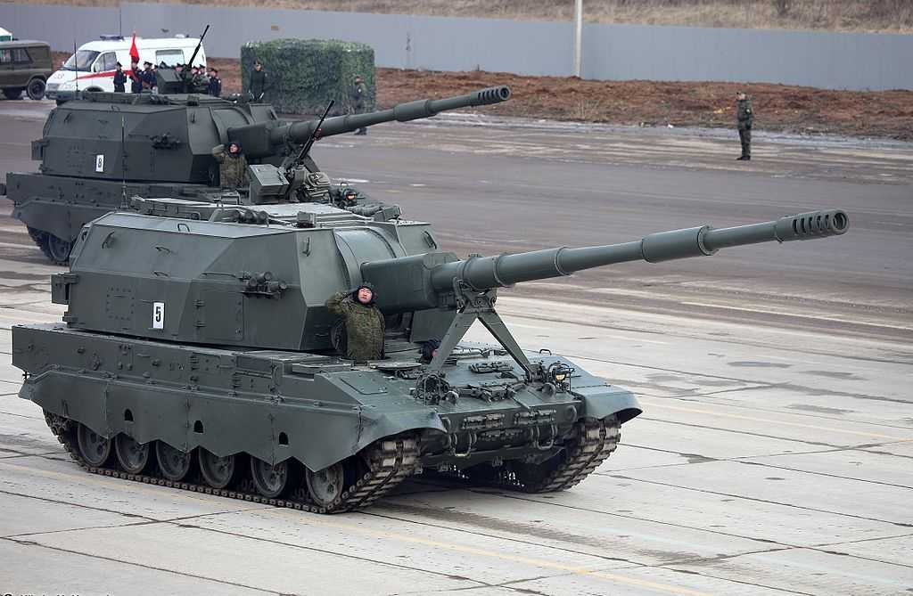 На платформах были зафиксированы 4 единицы САУ 2С35 Коалиция-СВ. Их выпущено всего 12 штук. Главными отличиями данного вида оружия является высокая скорострельность и точность попадания. Калибр 152 мм.