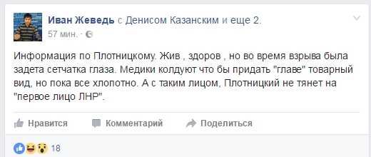 "Информация по Плотницкому. Жив, здоров, но во время взрыва была задета сетчатка глаза. Медики колдуют, чтобы придать "главе" товарный вид, но пока все хлопотно. А с таким лицом, Плотницкий не тянет на "первое лицо ЛНР"" - пишет он.