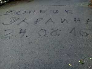 Рискуя оказаться “на подвале”, черной краской на асфальте в одном из самых любимых для пеших прогулок мест дончане написали “Донецк – Украина. 24.08.2016”.