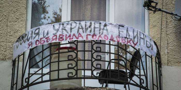 Отмечается, что на улице Заньковецкой появился плакат с надписью «Россия и Украина Едины. Я обьявила голодовку». Соответствующую надпись разместила у себя на балконе жительница одного из домов.
