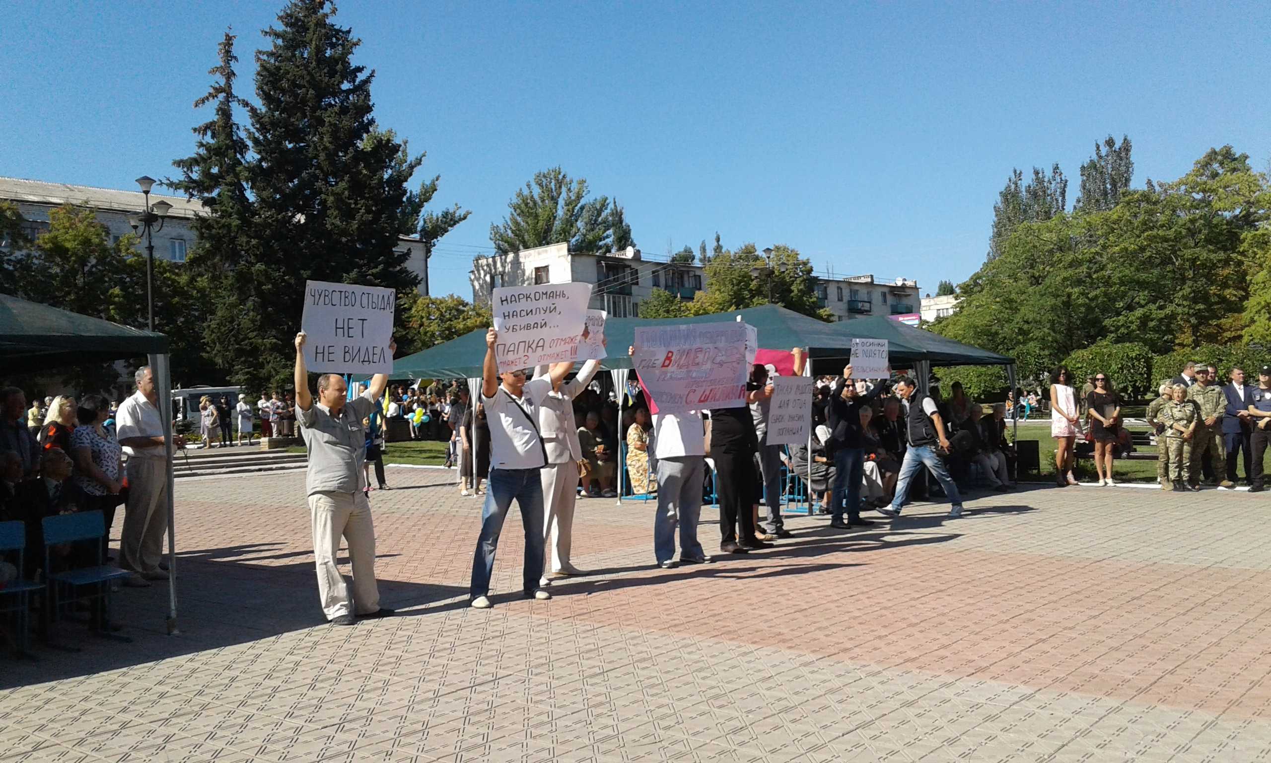 2 сентября на митинге возле мемориального комплекса "Память", посвященному Дню города Лисичанска, во время выступления городского головы Сергея Шилина общественные активисты подняли плакаты с призывами открыть правду по делу младшего сына градоначальника.