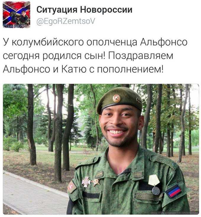 «У колумбийского ополченца сегодня родился сын! Поздравляем Альфонсо и Катю с пополнением», - написали в подписи к фото сепаратисты. На снимке изображен парень латиноамериканской внешности в военной форме с нашивкой «ДНР».
