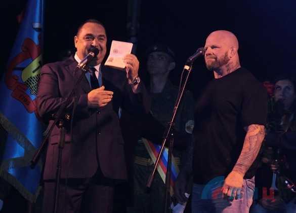 Глава "ЛНР" Игорь Плотницкий торжественно вручил "паспорт республики" американскому бойцу смешанных единоборств Джеффу Монсону на концерте в Луганске, посвященном 221-й годовщине основания города.