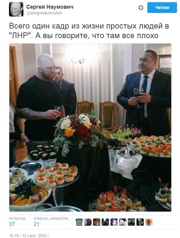 "О это же американец, самый настоящий, у нас в гадюкино. Так а ну быстро все самое лучшее на стол, это же американец", "... в блокадном Ленинграде тоже икру ели члены правительства", "Повесить бы баннер с этой фоткой в Луганске и написать:""Глава" и "гражданин" "калякают" за "республику", - комментируют публикацию пользователи сети.