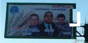 На плакате три боевика, Плотницкий, Карякин и теперь уже убитый Цыпкалов, дружно зазывают своими физиономиями на выборы.