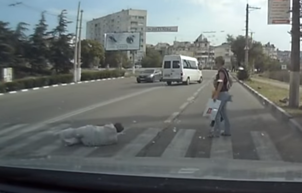Видео под названием "Обычный день в Севастополе" было снято на авторегистратор. На кадрах видно, как микроавтобус, не обращая внимания на людей, которые переходят дорогу по "зебре", сбивает мужчину. Идущая позади женщина с ребенком спокойно проходит мимо лежащего на асфальте человека.