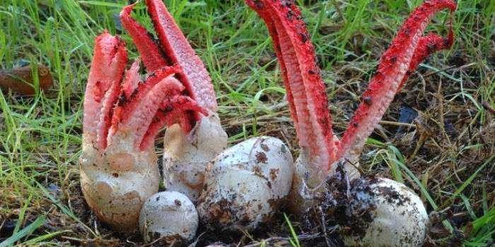 Необычный для Украины гриб имеет красные лепестки, которые делают его похожим с морской звездой. Его нашли любители «тихой охоты» в лесопосадке возле Ужгорода. Находка была сфотографирована и опубликована в социальной сети.