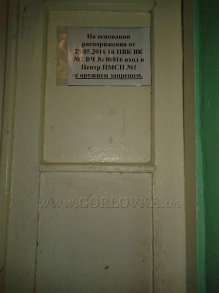 Так, на двери одного из кабинетов горловской поликлиники на 5 квартале вывесили объявление о том, что с оружием вход воспрещен.