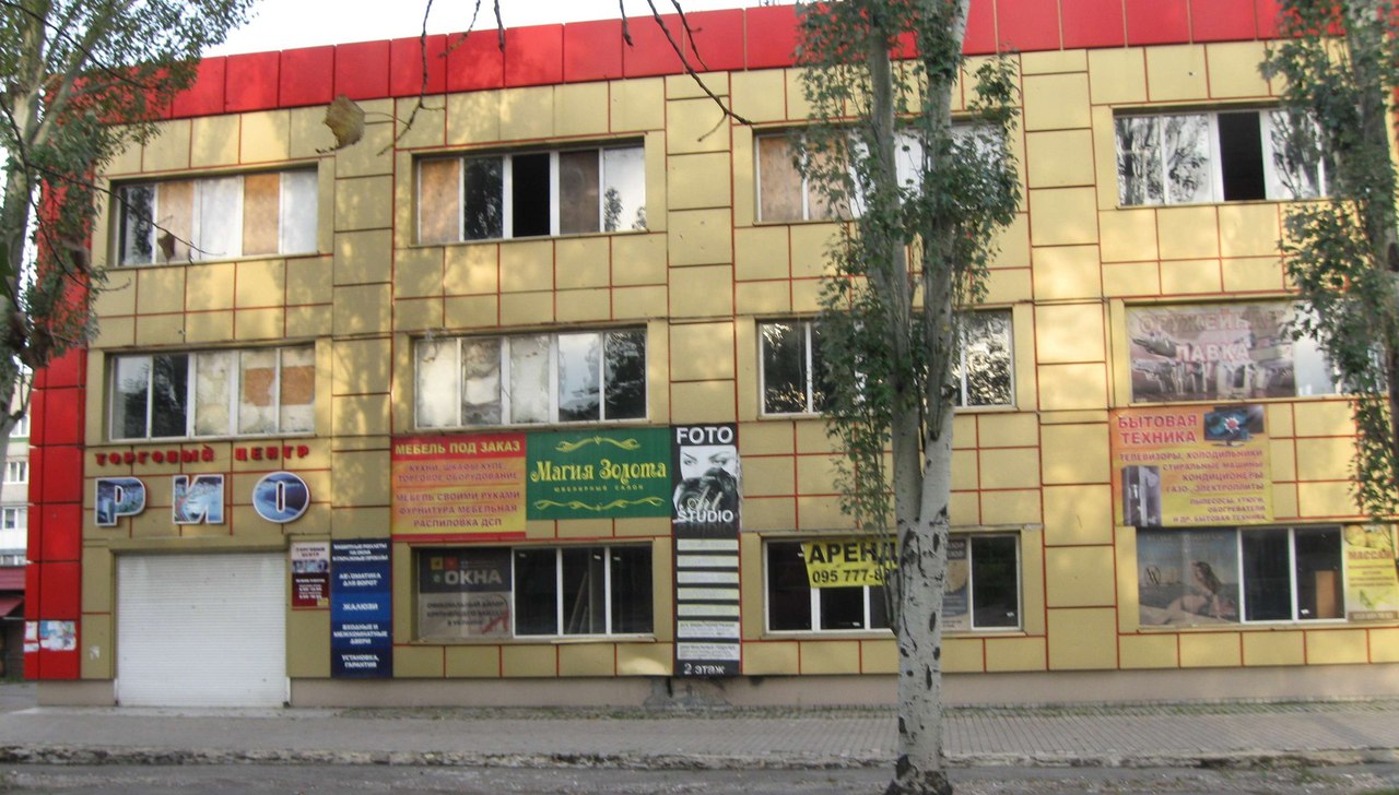 Торговий центр "РІО" сьогодні (колишній універмаг). Минуло півтора року після страшних обстрілів - в будівлі досі не вставлене скло, закриті двері, старі вивіски нагадують про минуле життя при Україні", - коментує автор фото.