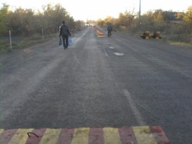 По ее словам, очереди из автомобилей на блокпостах собирают несколько сотен машин — в день ее проезда их было 209. Пешеходам же до блокпостов нужно дойти пешком. «Наша дорога лежит теперь мимо „ежей“, табличек „Осторожно, мины!“ и потертого жизнью знака-указателя к самому пункту пропуска… Передо мной около 250 человек, но очередь движется быстро. На одном месте мы стоим буквально по паре минут, затем очередь сдвигается сразу на десяток человек (именно столько помещается у лавки, на которой производится таможенный досмотр). Буквально за 30 минут я оказываюсь у этой лавки и после беглого осмотра еще 10 минут уходит у меня на паспортный контроль (понравились мне в этот раз окошечки для паспортов) Получаю заветный талончик», — рассказала автор.