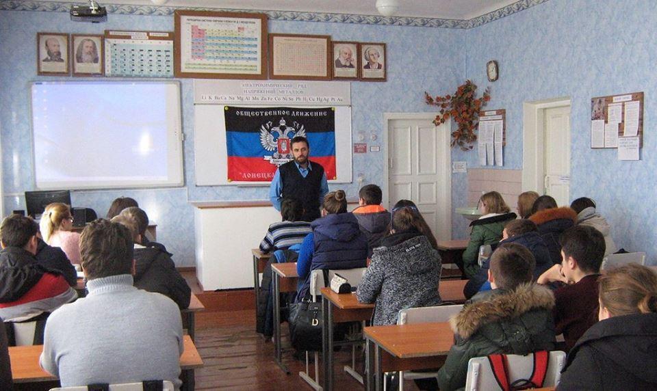 "Школа на территории, подконтрольной ДНР. Дети сидят на уроках в верхней одежде, потому что в классах нет отопления. Флаг боевиков на доске согревает их вместо батарей.