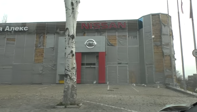 В ролике отдельно собраны кадры с мест, где раньше располагались престижные автосалоны Донецка: Nissan, Ford, Toyota, Lexus, Mitsubishi и Porsche.
