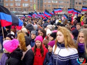 В толпе людей не наблюдалось обилие флагов "республики", а, к примеру, в оккупированной Горловке происходящее напоминало странное действо, нежели некогда "великий праздник" советского пролетариата.