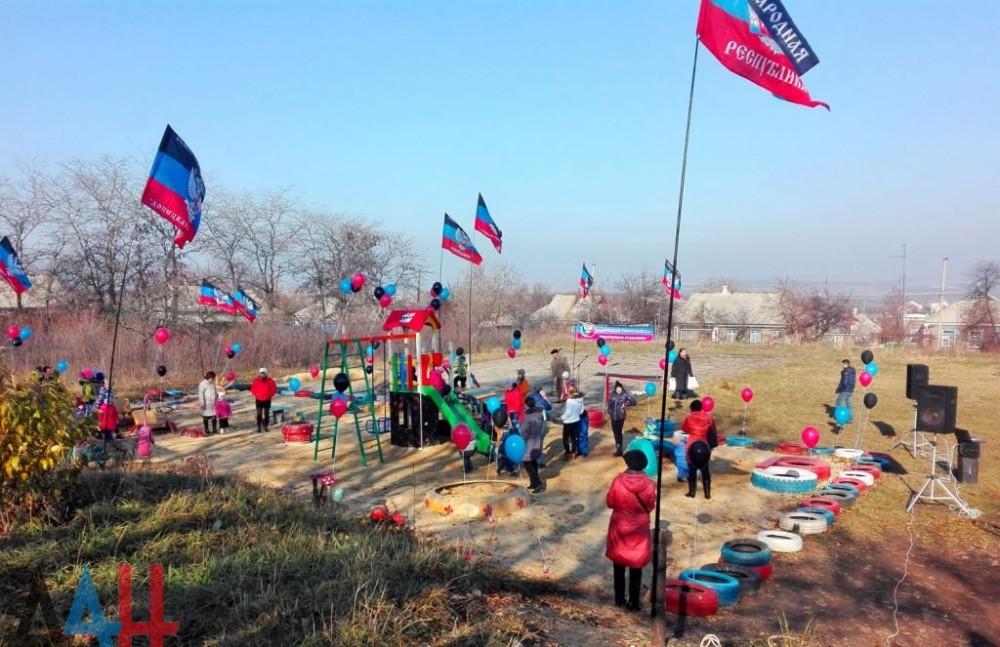 На просторах "процветающей" "ДНР" пафосно открыли небольшую игровую площадку для малышни. На "празднике" рябило в глазах от цветов флага никем не признанной "республики".