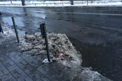 Сніг, що лежав на узбіччях, топиться і стікає людям просто під ноги. Подекуди в місті поробились величезні "озера".