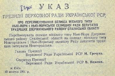 Справка: До 1951 года поселок городского типа назывался Нью-Йорк. Под таким названием он упоминается в повести Виктора Некрасова «В родном городе». Переименован населенный пункт в Новгородское был по указу Президиума Верховного Совета Украинской ССР от 19 октября 1951.