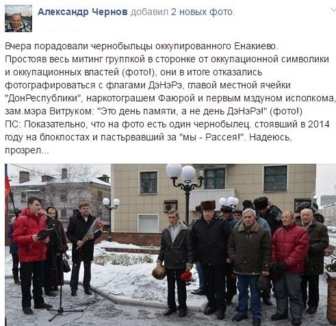 Как написал блогер Александр Чернов, в митинге, посвященном знаменательной дате участвовали "руководитель исполкома Енакиевского отделения ОД "Донецкая Республика" Антон Фаюра и "заместитель главы администрации Енакиево" Игорь Витрук. Первого в городе давно знают как человека, причастного к торговле наркотиками, второго – как любителя взяток и "откатов".