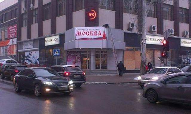 Оккупанты не стали кардинально переделывать помещение и его оформление. Они просто завесили вывеску «Terranova» баннером с надписью «Москва».