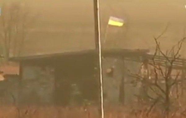Желто-синий флаг отныне развивается рядом с позициями боевиков "ДНР" и всего на расстоянии в полкилометра от разрушенного в ходе боевых действий в 2014-15 годах Донецкого аэропорта.