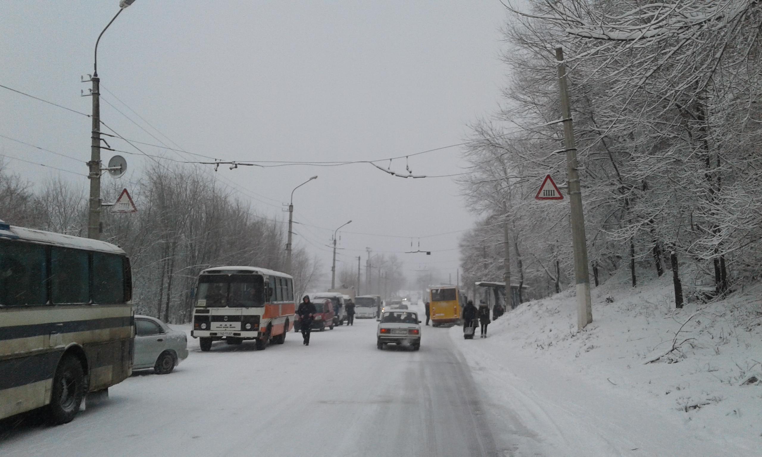 Перед спуском в районе Кирпичного патрульные полицейские останавливают транспорт, так как может сложиться аварийная ситуация. Внизу улицы уже произошло два ДТП с участием двух легковых машин и двух пассажирских микроавтобусов. Они перекрыли въезд на гору. Дорога почищена от снега, однако очень скользкая - по ней невозможно ходить и ездить. Движение идет только по Рабочей горе вниз, а некоторые пытаются подняться вверх.
