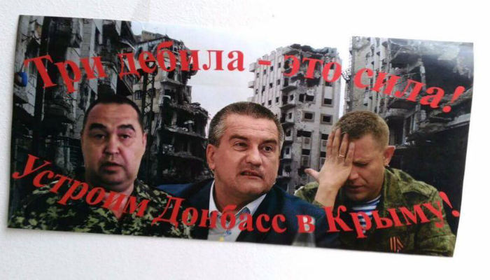 В населенных пунктах аннексированного Россией Крыма на днях появились сатирические листовки с изображениями так называемого «главы» Крыма Сергея Аксенова и главарей «ДНР» и «ЛНР» Александра Захарченко и Игоря Плотницкого.
