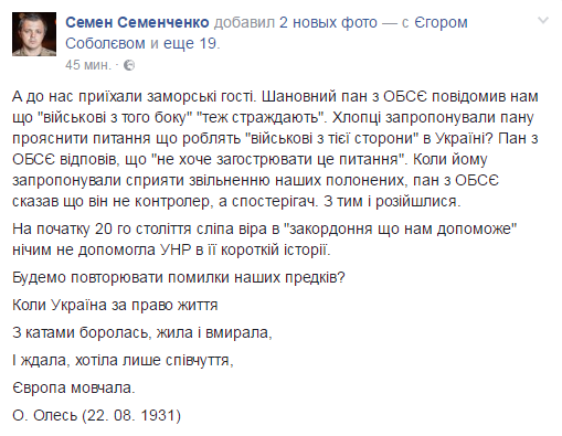 Как сообщил на своей странице в соцсети бывший комбат, а ныне нардеп Семен Семенченко, который возглавляет активистов, мониторы были обеспокоены тем, что "военные с той стороны страдают".