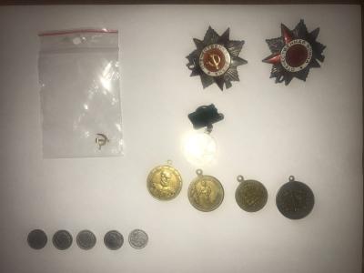 В ходе дальнейшего осмотра среди вещей гражданки были найдены 5 серебряных монет 20-го века, 5 юбилейных медалей, 2 ордена времен второй мировой войны и личное дело генерала авиации красной армии.