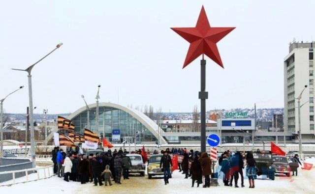 «Мэр» Луганска отметил: «Сегодня мы с ветеранами подъехали к стеле, которая была установлена в прошлом году нашими бойцами уже современной войны 2014 года — „Ночными волками“.К сожалению, за это время дважды эта звезда была повреждена, и вот мы ее в третий раз установили, и, я думаю, что уже навсегда».